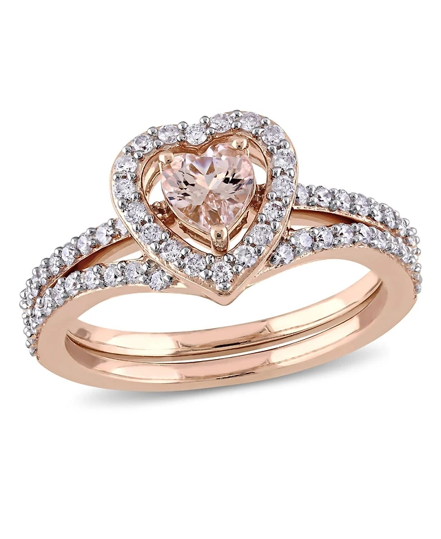 Morganite and Diamond Heart Halo interlocking Bridal Ring Set