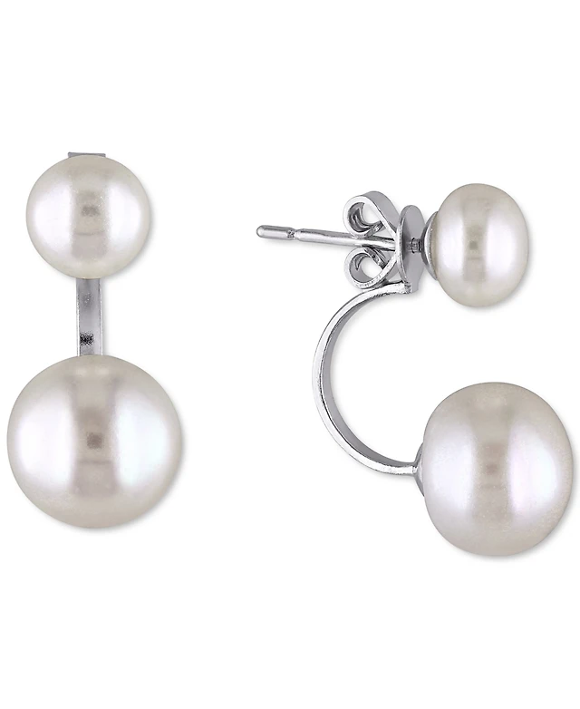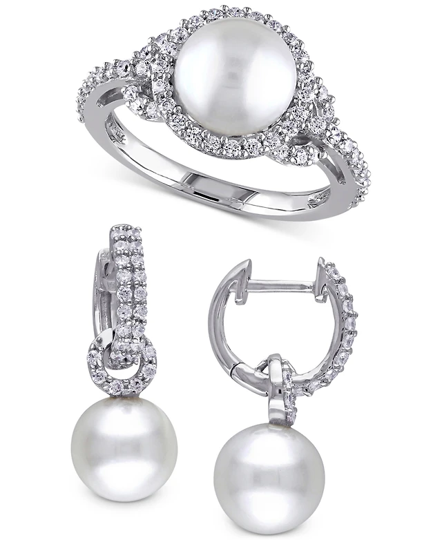 2-Pc. Set Cultured Freshwater Pearl (8-9mm) & Cubic Zirconia Dangle Hoop Earrings Halo Ring Sterling Silver