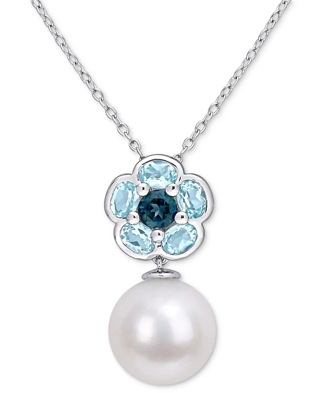 Cultured Freshwater Pearl (8-1/2mm) & White Topaz (1 ct. t.w.) Flower 18" Pendant Necklace in Gold-Tone Plated Sterling Silver