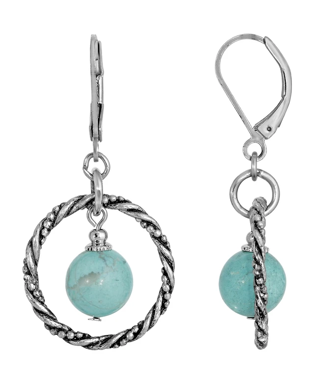 2028 Silver-Tone Genuine Stone Turquoise Round Stone Hoop Earrings