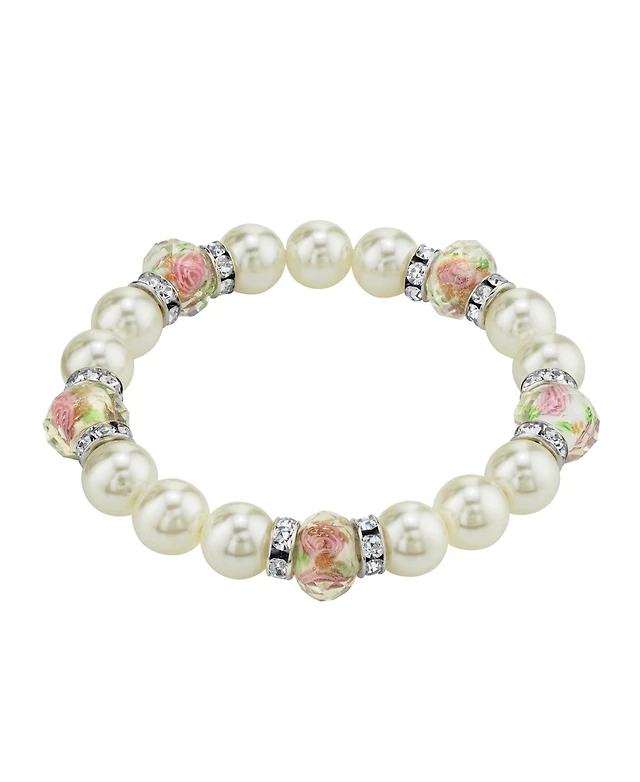 2028 Silver Tone Faux Pearl Pink Flower Beaded Stretch Bracelet