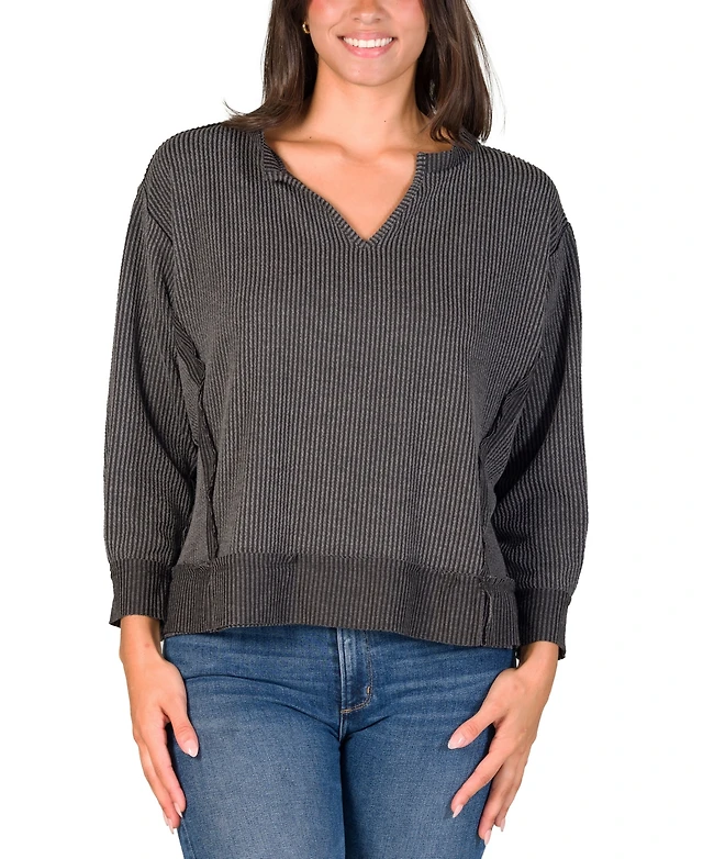 24seven Comfort Apparel Women's Relaxed Fit Ribbed Knit V Neck Sweatshirt Top
