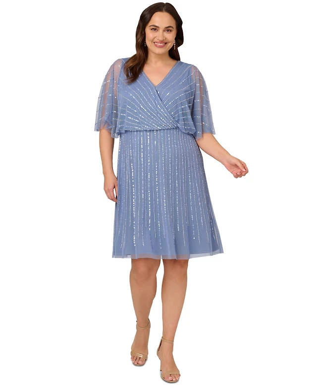 Adrianna Papell Plus Surplice-Neck Beaded Short Dress