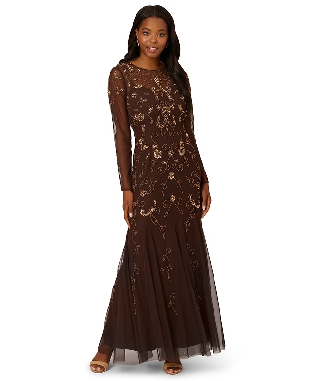 Adrianna Papell Women's Long-Sleeve Beaded Full-Length Gown