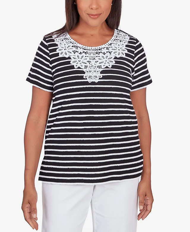 Alfred Dunner Women's Classic Neutrals Lace Neck Striped Split Hem T-shirt