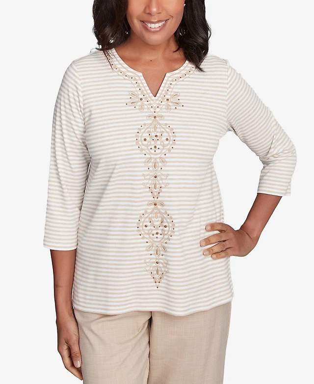 Alfred Dunner Women's Nantucket Beaded Floral Striped Top
