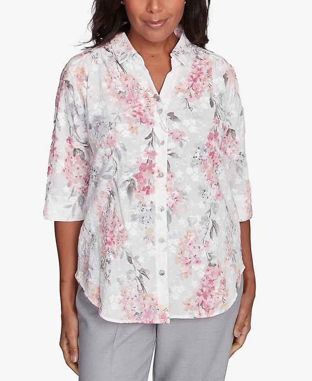 Alfred Dunner Women's Estate of Mind Collared Button Front Hydrangea Top