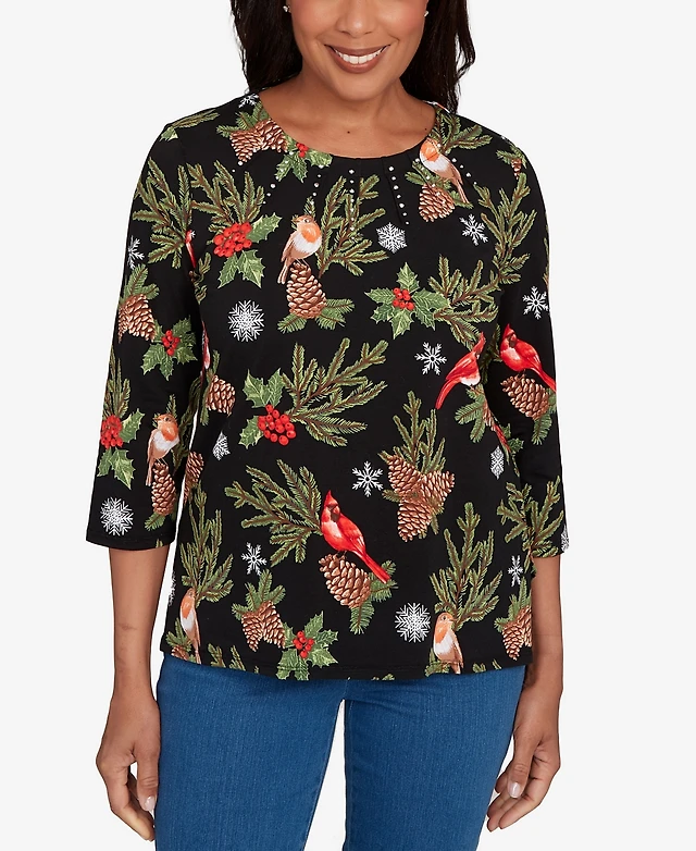 Alfred Dunner Women's Classic Cardinals and Pinecones Embellished Top