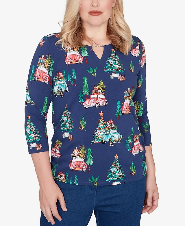 Alfred Dunner Plus Classic Christmas Tree Print Beaded Keyhole Neck Top