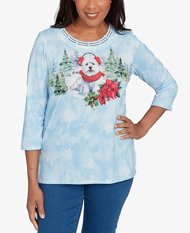Alfred Dunner Women's Classic Holiday Dog Earmuffs Crew Neck Top