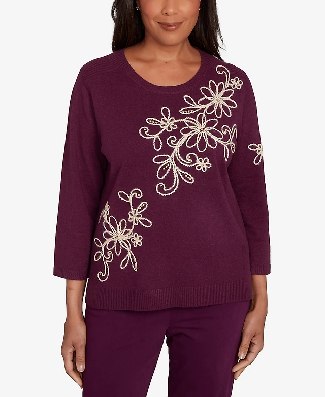 Alfred Dunner Petite Urban Legend Diagonal Floral Embroidered Sweater
