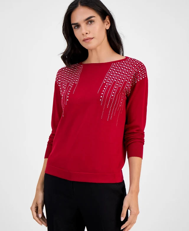 Ak Anne Klein Petite Embellished Boat-Neck Long-Sleeve Top