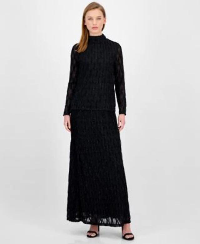 Anne Klein Womens Glitter Long Sleeve Mock Neck Top Glitter Flared Maxi Skirt