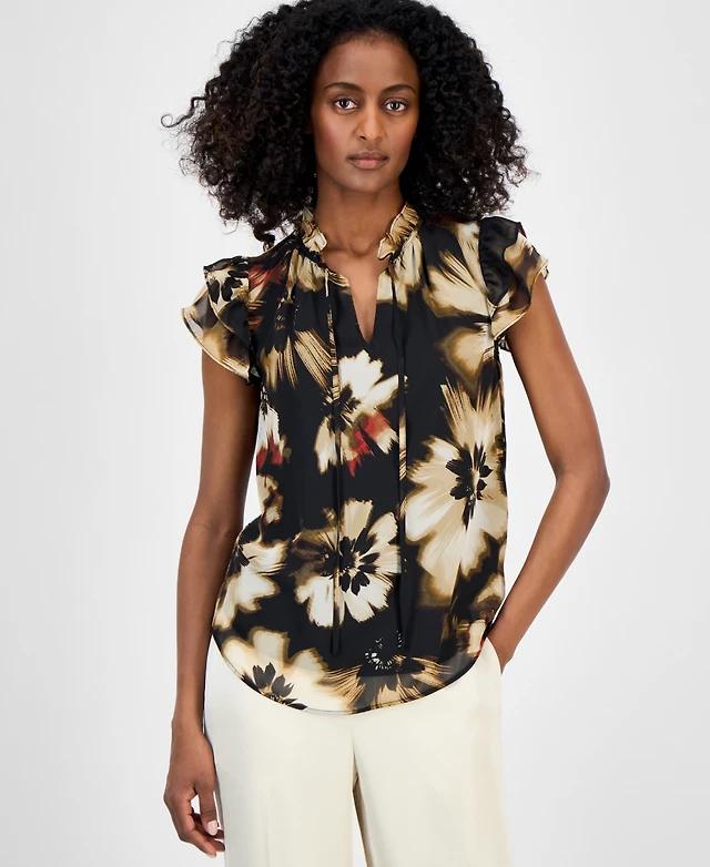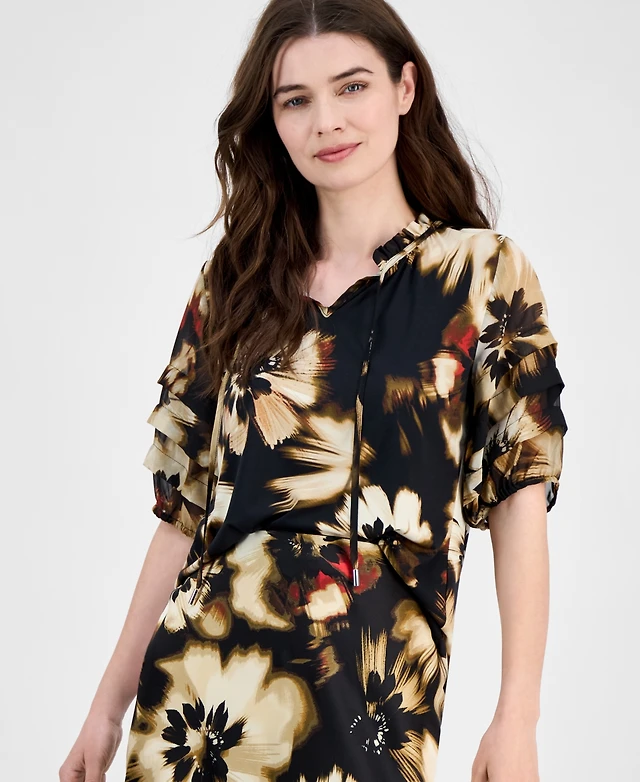 Anne Klein Women's Pleated-Sleeve Floral-Print Split-Neck Top