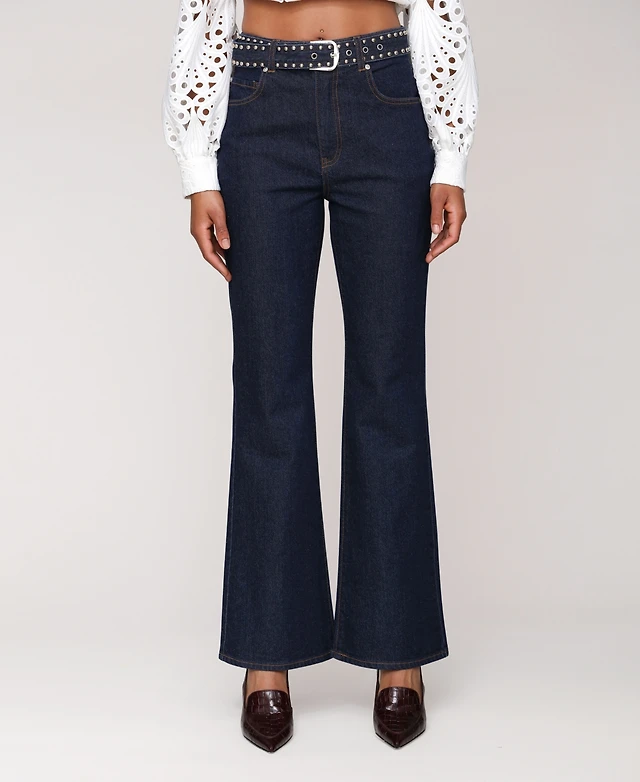 Avec Les Filles Women's Studded Belt High Rise Boot Cut Jeans