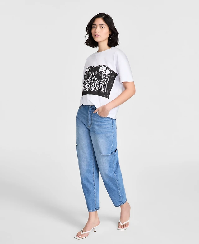 Bar Iii Women's Cotton Cut-Out Slash Barrel-Leg Denim Pants, Exclusively at Macy's