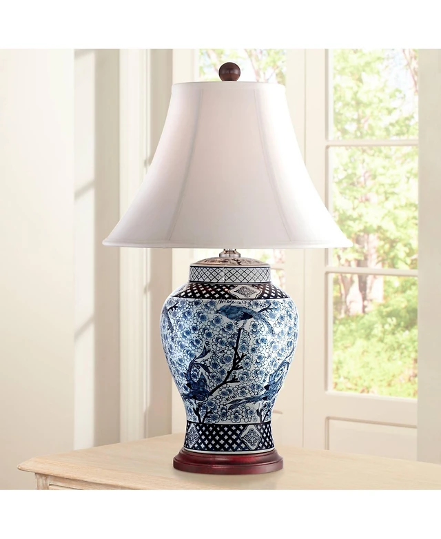 Iris Vintage like Asian Chinese Style Table Lamp 28" Tall Porcelain Blue Floral Jar Geneva White Drum Shade Decor for Living Room Bedroom House B