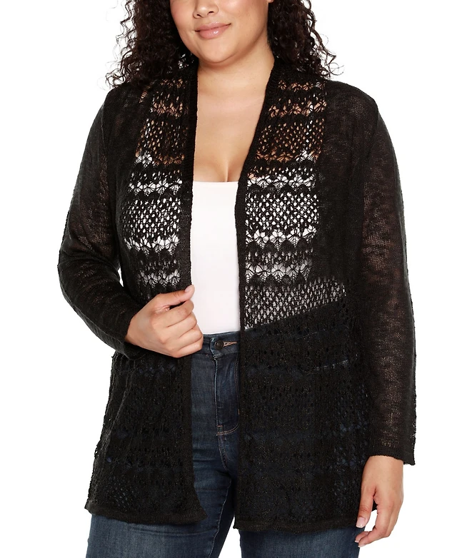 Belldini Plus Open-Front Pointelle-Trim Cardigan Sweater