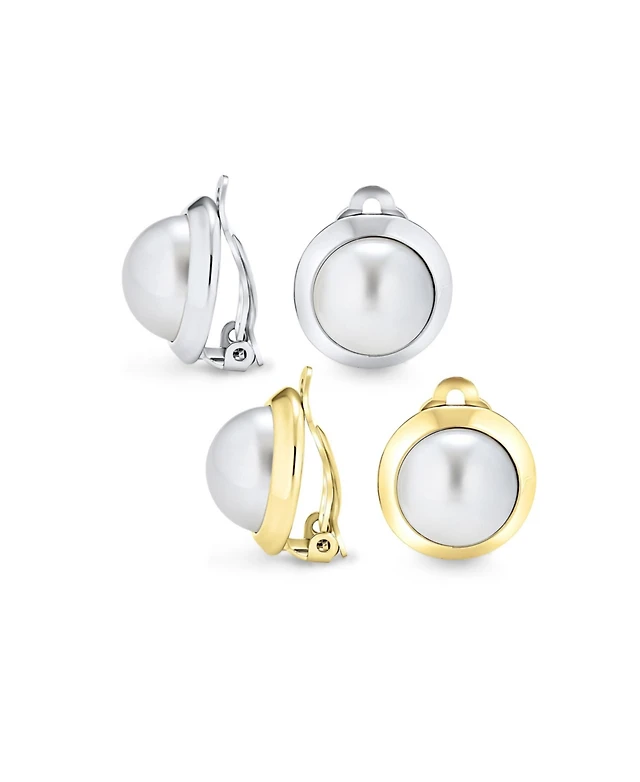 Bling Jewelry Set of 2 Button Style Round Dome Bezel Pearl Clip-On Earrings in Gold Plated Brass