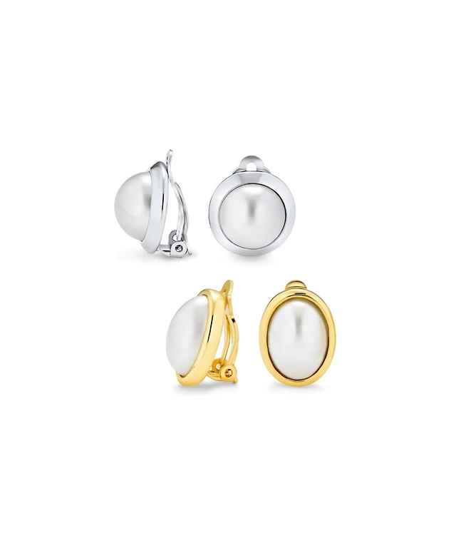Bling Jewelry Set of 2 White Pearl Cabochon Oval Clip-On Earrings in Silver Gold Plated Brass