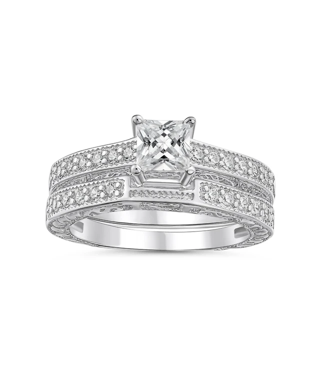 Bling Jewelry Sterling Silver Art Deco Style 2CT Princess Cut Cz Solitaire & Pave Band Ring Set