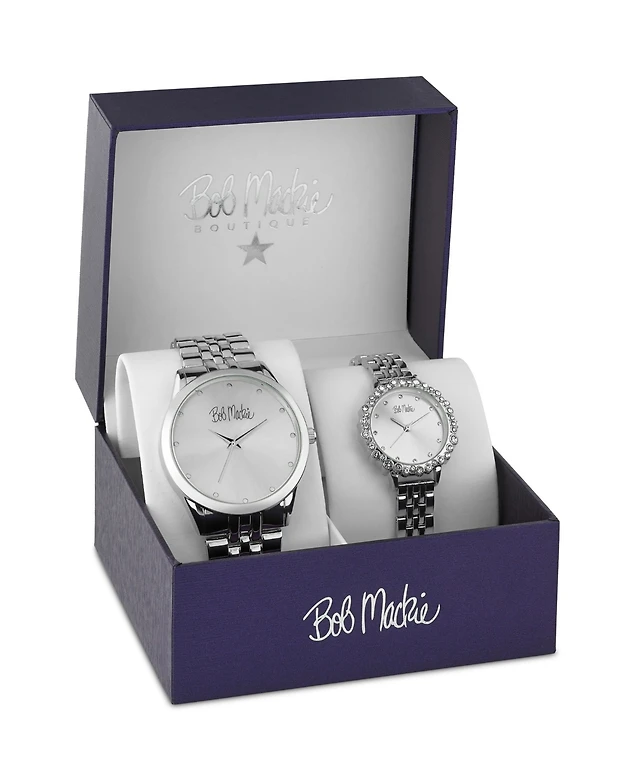 Bob Mackie Men's and Women's Silver-tone Base Metal Bracelet 2 Piece Watch Set 45mm and 36mm