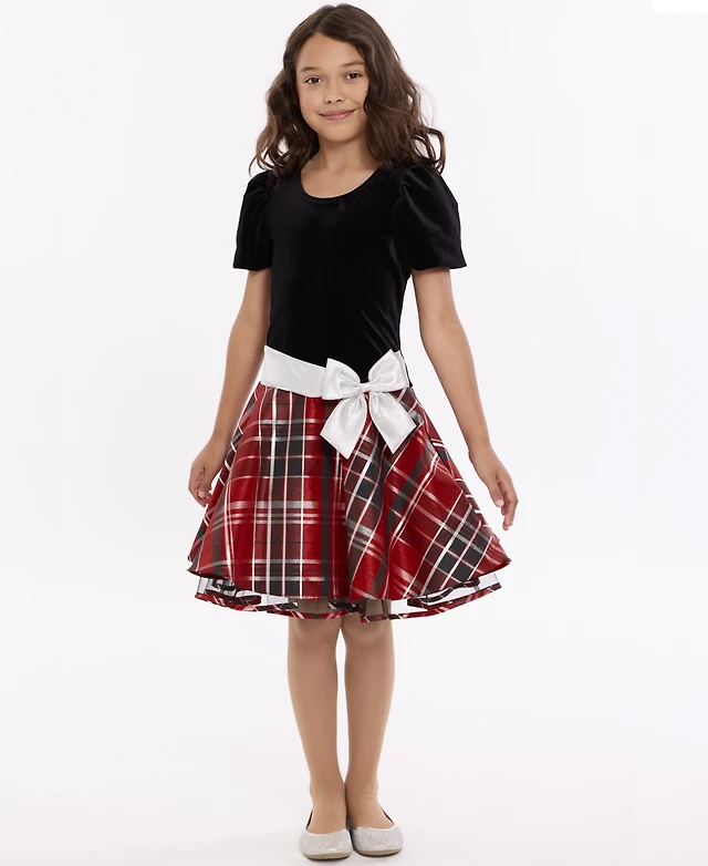 Bonnie Jean Girls 2-6X Short Sleeve Velvet to Tiered Plaid Dress