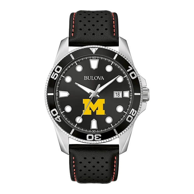 Men's Bulova Black Michigan Wolverines Corporate Collection Leather Strap Watch