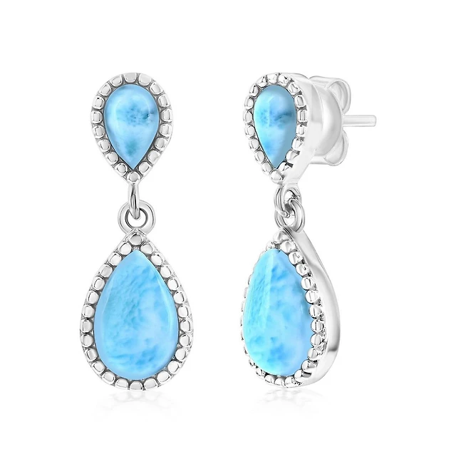 Caribbean TreasuresSterling Silver, Double Pear-Shaped Larimar w/Beaded Border Earrings