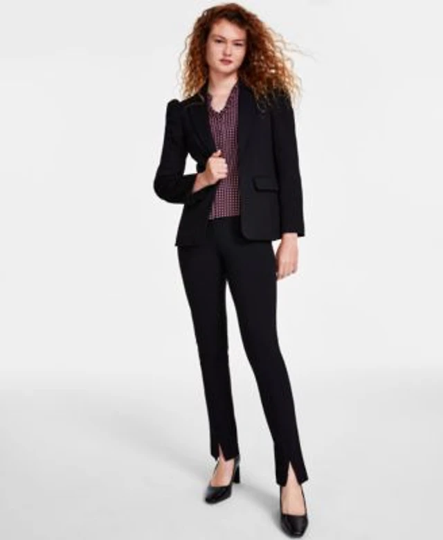 Cece Womens Puff Shoulder Open Front Long Sleeve Blazer Soft Texture V Neck Button Front Blouse Front Slit Straight Leg Pull On Ponte Pants