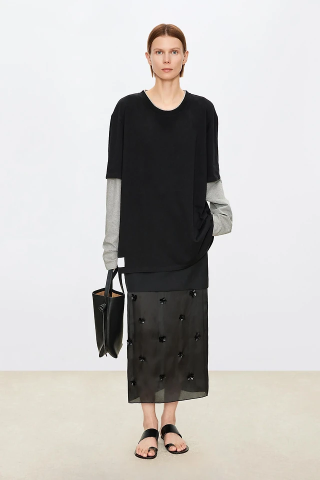 Double-Layer Raw Edge & Bias-Cut Silk Trim Long-Sleeve