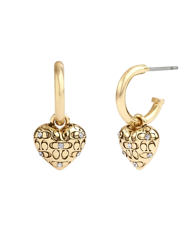 Coach Faux Stone Signature Quilted Heart Charm Huggie Earrings