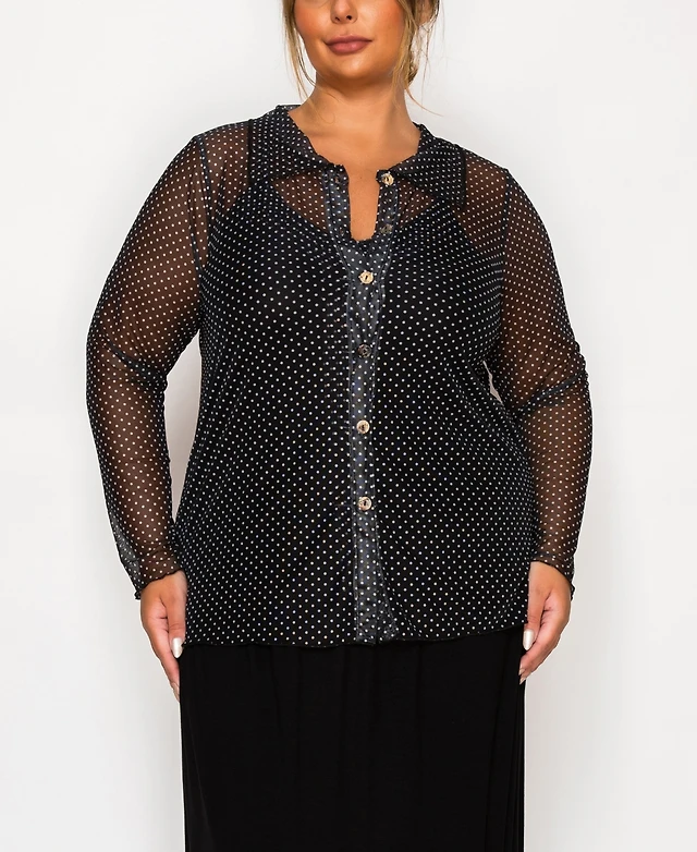 Coin 1804 Plus Dot Mesh Button Front Long Sleeve Top