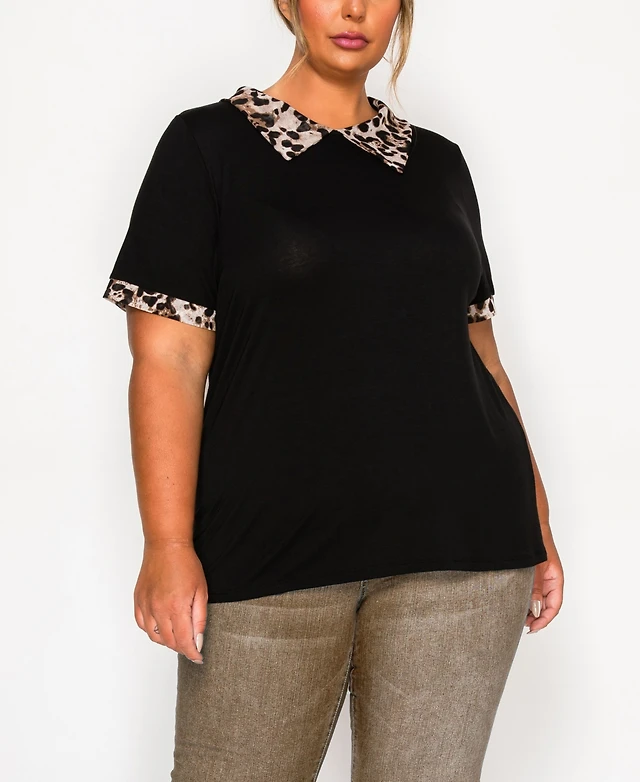 Coin 1804 Plus Leopard Print Mesh Collar Keyhole Back Short Sleeve Top