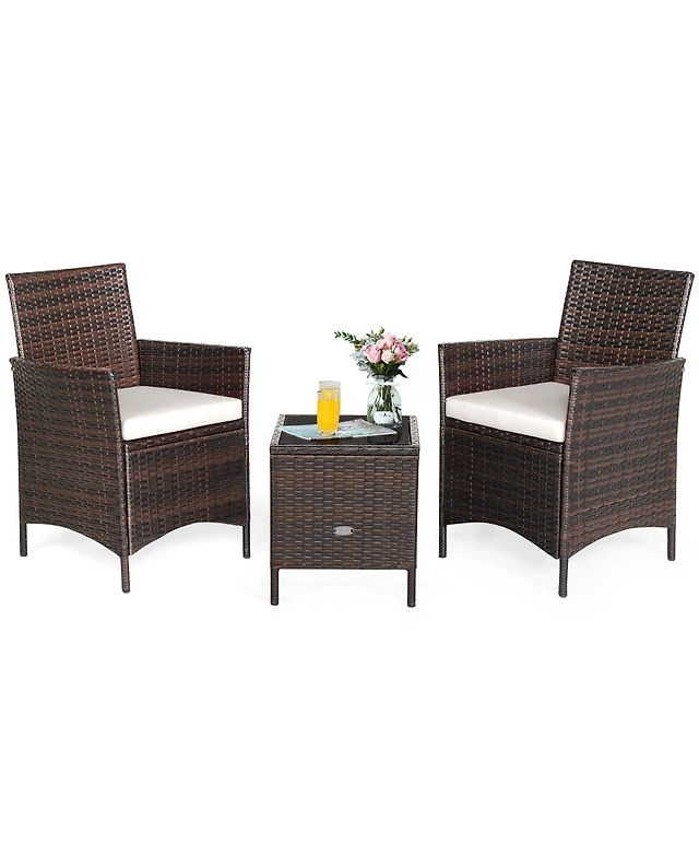 3PCS Patio Rattan Furniture Set Cushioned Sofa Glass Tabletop Deck