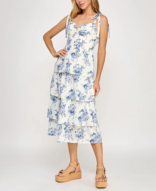 Crystal Doll Juniors' Floral Print Tie-Shoulder Tiered Dress