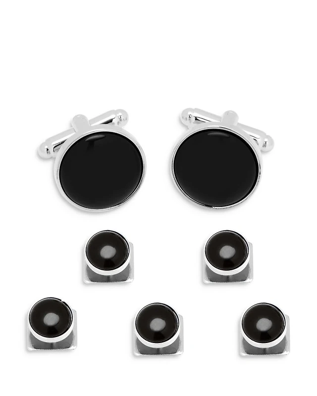 Onyx Inlay Silver Plated Round Stud & Cufflink Set