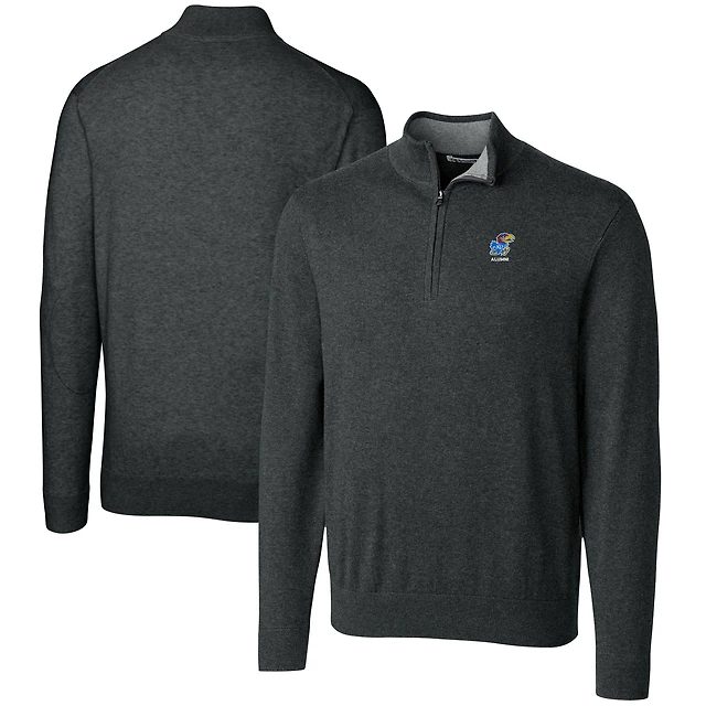 Men's Cutter & Buck Heather Charcoal Kansas Jayhawks Alumni Logo Lakemont Tri-Blend Quarter-Zip Pullover Sweater