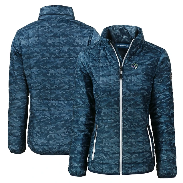 Women's Cutter & Buck Navy Gwinnett Stripers Rainier PrimaLoft Eco Insulated Camo Full-Zip Puffer Jacket