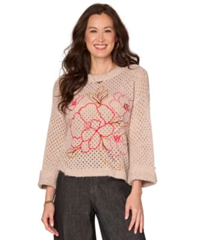 Democracy Womens Floral Embroidered Round Neck Sweater Ps 3x