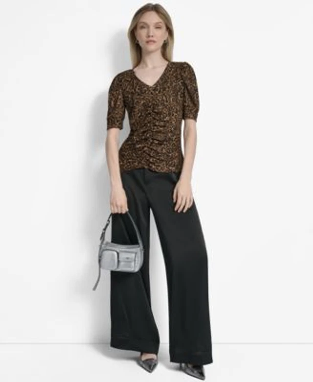 Dkny Womens Printed Puff Sleeve Ruched Top Glazed High Rise Seamed Cuff Wide Leg Pants
