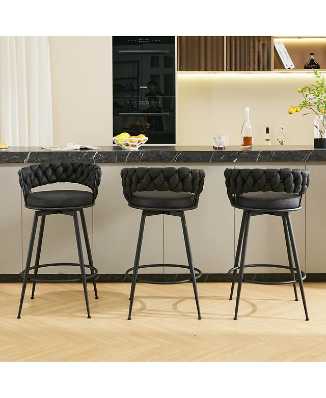 Dyhome 28 inch Bar Stools Set of 3, Modern Counter Height Stools, 360° Swivel Suede Fabric Stool Chairs with Woven Back and Footrest
