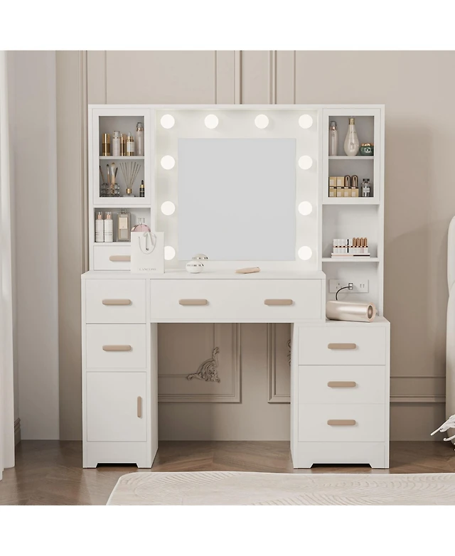 Dyhome Vanity Desk with Mirror and Lights and Charging Station with 7 Drawers & 3 Cabinets