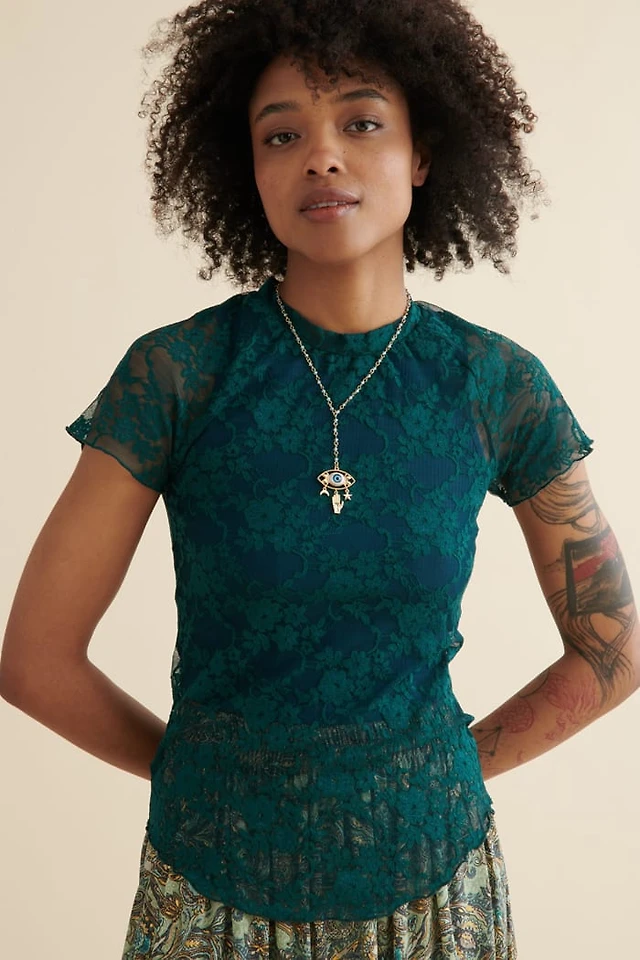 Buy Brown Lace Overdyed Bell Sleeve Shirt Online at Earthbound Trading