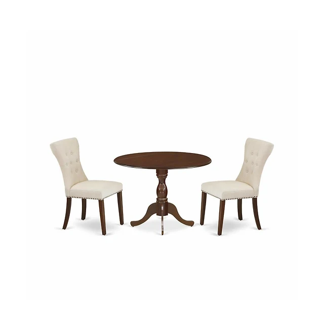 East West Furniture 3 Piece Dining Table Set Consists of 1 Drop Leaves Wooden Dining Table and 2 Linen White Mid Century Modern Dining Chairs with Sla