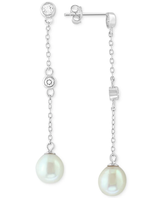 Effy Freshwater Pearl (7mm) & White Topaz (1/5 ct. t.w.) Linear Drop Earrings in Sterling Silver