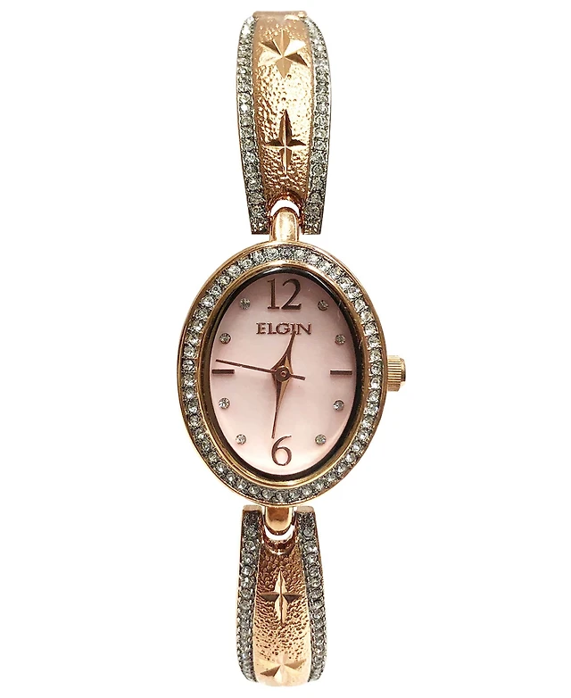 Elgin Women's Oval Face with Diamond Half Bangle Rose-Tone Strap Watch