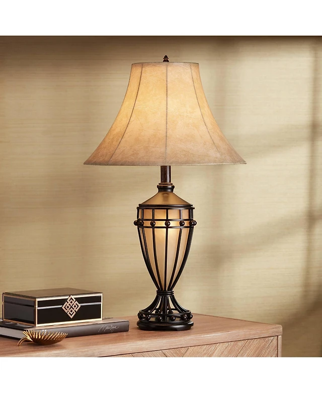 Franklin Iron Works Naomi Industrial Rustic Table Lamp 25" High Aged Bronze Brown Mica Drum Shade for Bedroom Living Room Bedside Nightstand Offi