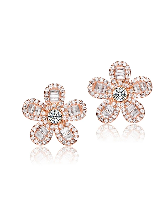 Sterling Silver 18K Rose Plated Clear Cubic Zirconia Flower Stud Earrings