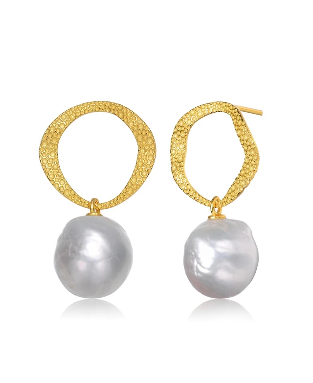 Sterling Silver 14K Gold Plated with Coin Shapped Freshwater Pearl Dangle Earrings